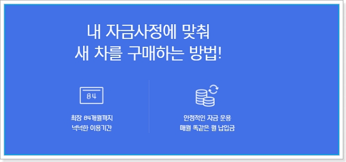 현대캐피탈에서 운영중인 신차론은 신차로 구입시 자금사정에 맞추어 구매하는 방법을 제시하며, 최장84개월까지 이용기간을 설정할 수 있습니다.
