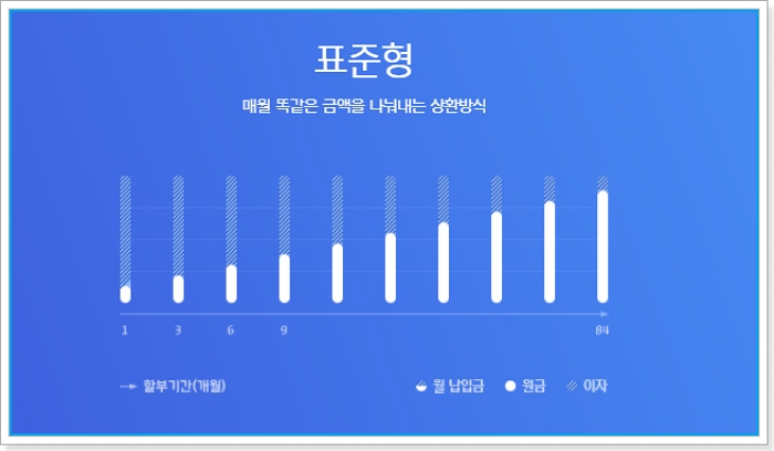 ▶ 상환방식 : 현대캐피탈 신차론은 표준형방식으로 상환하게 되며, 매월 일정금액의 월 납입금 상환하며, 최대 84개월까지 대출기간을 설정하여 월 납입금 부담 감소하게 됩니다.